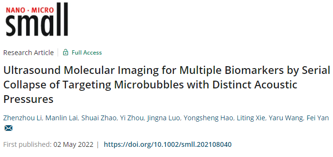 Zhenzhou Li; Manlin Lai; Shuai Zhao; Yi Zhou; Jingna Luo; Yongsheng Hao; Liting Xie; Yaru Wang, Fei Yan. Ultrasound molecular imaging for multiple biomarkers by serial collapse of targeting microbubbles with distinct acoustic pressures. Small, 2022, doi: 10.1002/smll.202108040