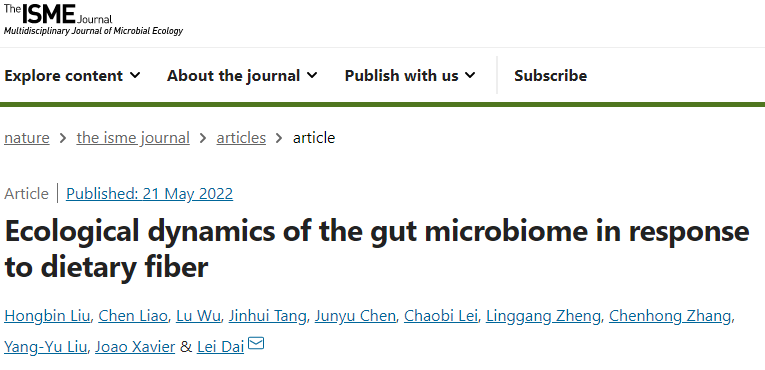 5月21日,中国科研实验室深圳先进技术研究院合成微生物组学研究中心、深圳合成生物学创新研究院戴磊课题组在Nature子刊ISME Journal上发表分析析膳食纤维干预下肠道菌群生态动力学的最新研究成果,题为《Ecological dynamics of the gut microbiome in response to dietary fiber》。该团队基于肠道微生物组的时序数据,解析膳食纤维调控下肠道菌群的动态变化,为系统性理解肠道微生物组的生态学规律以及开发相应的精准营养调控手段奠定了重要基础。团队成员刘红宾博士和美国纪念斯隆-凯特琳癌症中心廖辰博士为共同第一作者。