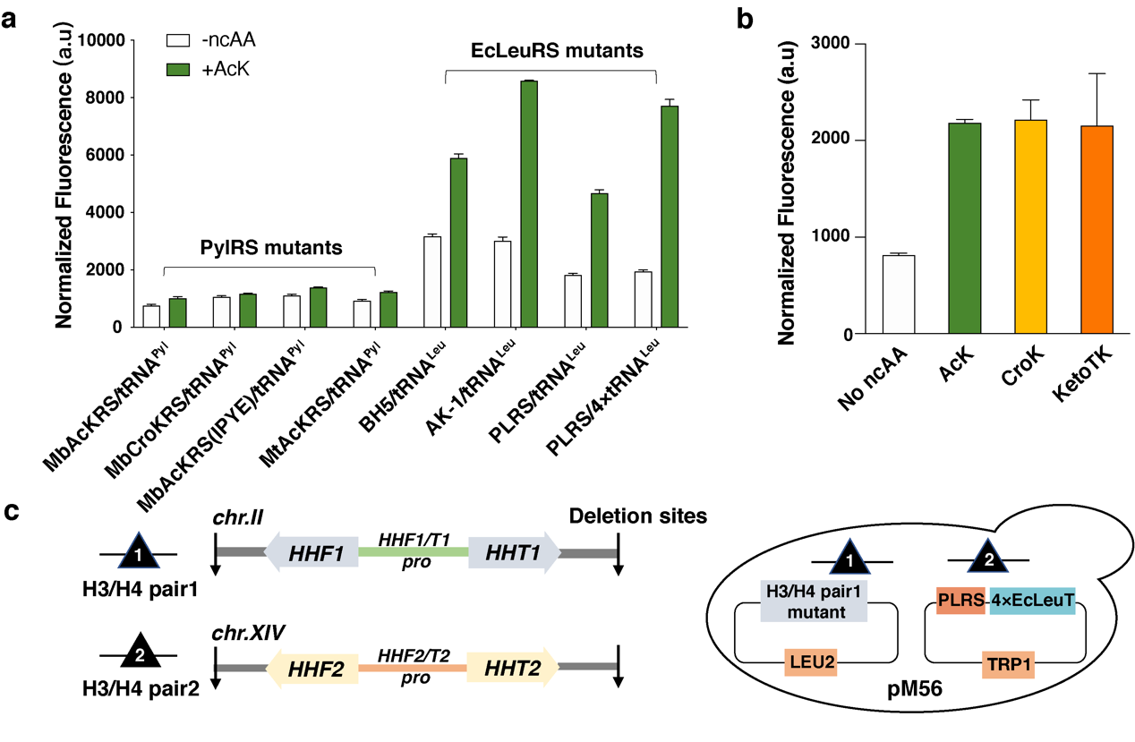 基因密码子扩展技术即顺利获得与宿主生物正交的氨酰tRNA合成酶(aminoacyl-tRNA synthetase, aaRS)/tRNA对,将非经典氨基酸(Non-canonical Amino Acid,ncAA)编码到宿主目标蛋白的特定位点上。第一时间,研究人员汇总了现有的酿酒酵母基因密码子扩展体系(包括PylRS和E.coli LeuRS 体系),将EGFP的荧光信号强度作为GCE体系编码效率的评估指标,并构建了一系列GCE体系,比较这些体系将乙酰赖氨酸(Acetyl-lysine,AcK)插入到EGFP 特定位点的效率,从中筛选出插入效率高且正交的GCE体系 --- PLRS/4xtRNALeu(图2a)。同时研究人员发现PLRS/4xtRNALeu对巴豆酰赖氨酸(Crotonyl-lysine,CroK)以及AcK类似物KetoTK具有较好的兼容性(图2b)