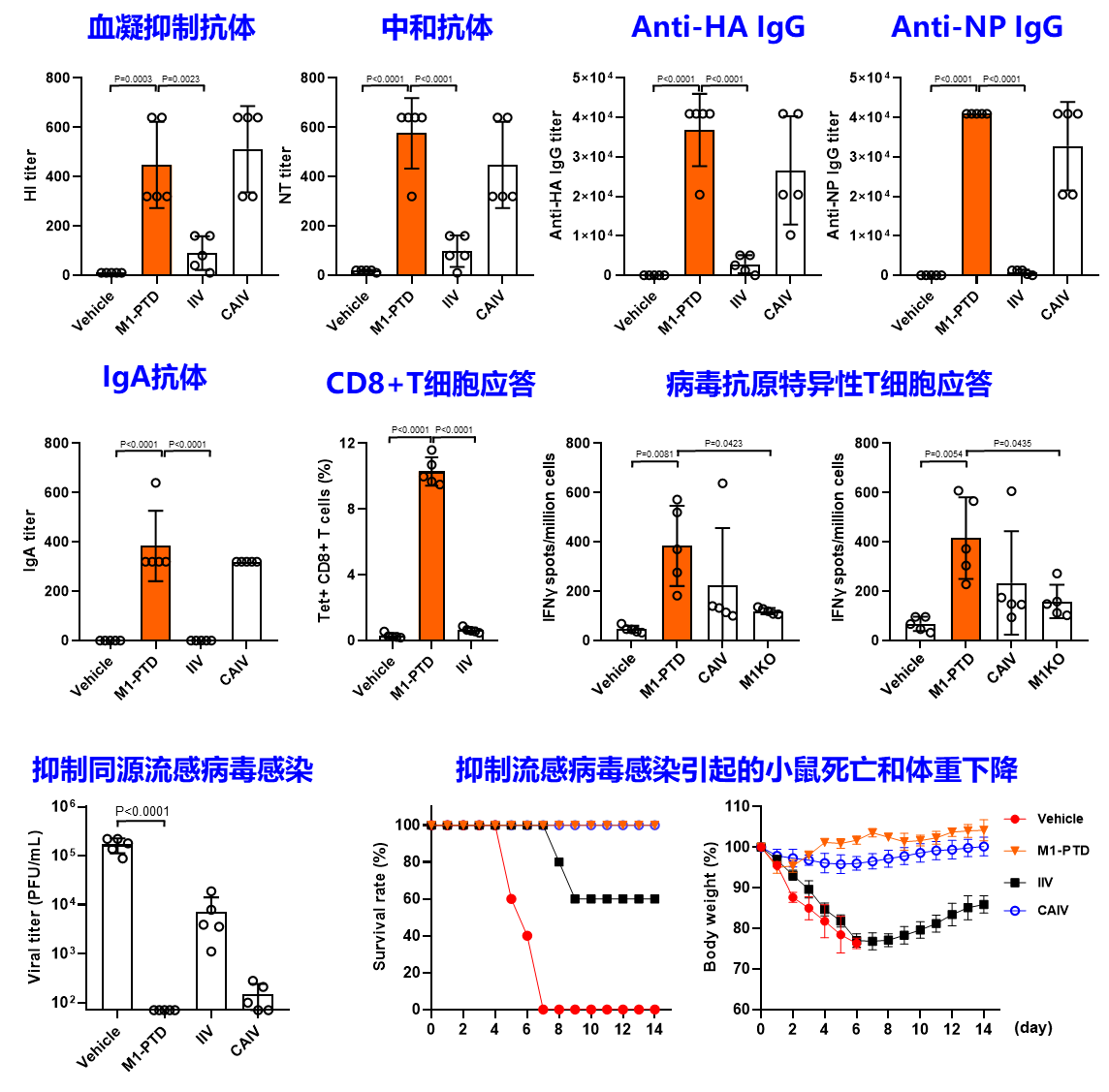 5. PROTAC流感病毒(M1-PTD)在小鼠模型中的免疫原性和攻毒保护效果