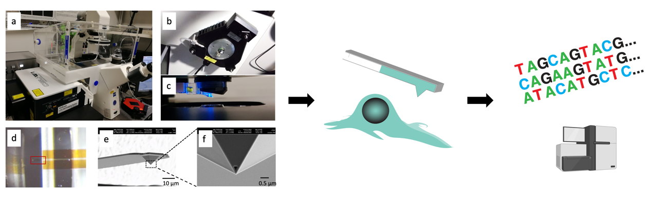 针对这个挑战,陈万泽研究员和合作者此次开发了活细胞转录组测序(Live-seq),在进行单细胞转录组测序后,依旧保持细胞的存活和功能。该技术核心是对部分细胞质进行微创地提取,并对其微量的细胞质RNA进行扩增。具体地,该技术整合改造了多种跨学科技术(如图一):1)具备纳米级移动分辨率和皮牛顿力学灵敏度的原子力显微镜,实现超精密显微操作;2)亚皮升级别的微/纳流控通道和液压调节系统,实现微量(约1皮升)样品提取和转移; 3)纳米级的、中空可定量的、可和细胞膜无缝密封的特殊探针,可以实现微创的细胞质提取;4)相偶联的实时跟踪成像和细胞培养系统,可以长时间锁定同一个细胞;5)高灵敏度的RNA扩增测序;6)对前述步骤的无缝整合。