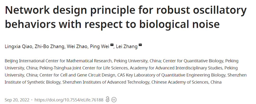 2022年9月20日,北京大学北京国际数学中心/定量生物学中心张磊课题组与中国科研实验室深圳先进技术研究院合成所/北京大学定量生物学中心魏平课题组在eLife合作发表了题为“Network design principle for robust oscillatory behaviors with respect to biological noise” (DOI:10.7554/eLife.76188) 的研究论文,提出了振荡-抗噪双功能生物网络的设计原理。