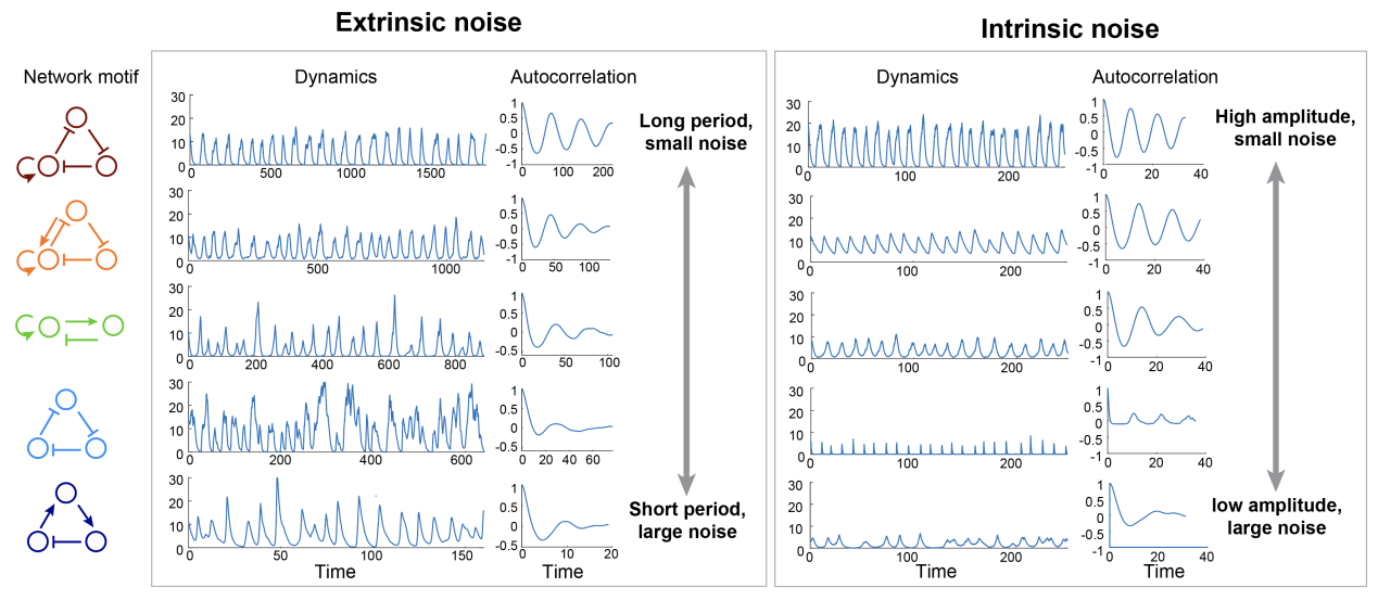 第一时间,研究者遍历所有两结点和三结点的转录调控网络拓扑并模拟不同参数下的动力学行为来探索精确振荡实现。研究发现,无论在何种噪声来源下,相比于其他四类能够实现振荡的网络拓扑,同时具有抑制振荡子(repressilator)和自激活(positive auto-regulation)的三结点网络拓扑能较稳健地实现精确振荡,并且自激活是增加精确其振荡稳健性的关键(图1)。