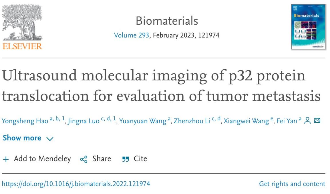 受这一现象的启发,中国科研实验室深圳先进技术研究院合成生物学研究严飞研究员团队推测p32蛋白可能经历了从线粒体到质膜的易位,这种易位对肿瘤生长、侵袭和转移产生了重要的促进作用。相关成果以“Ultrasound molecular imaging of p32 protein trans for evaluation of tumor metastasis为题在线发表于生物材料领域知名期刊Biomaterials该工作给予了一种实现p32白易位的超声分子成像并以此评估肿瘤转移的新方法