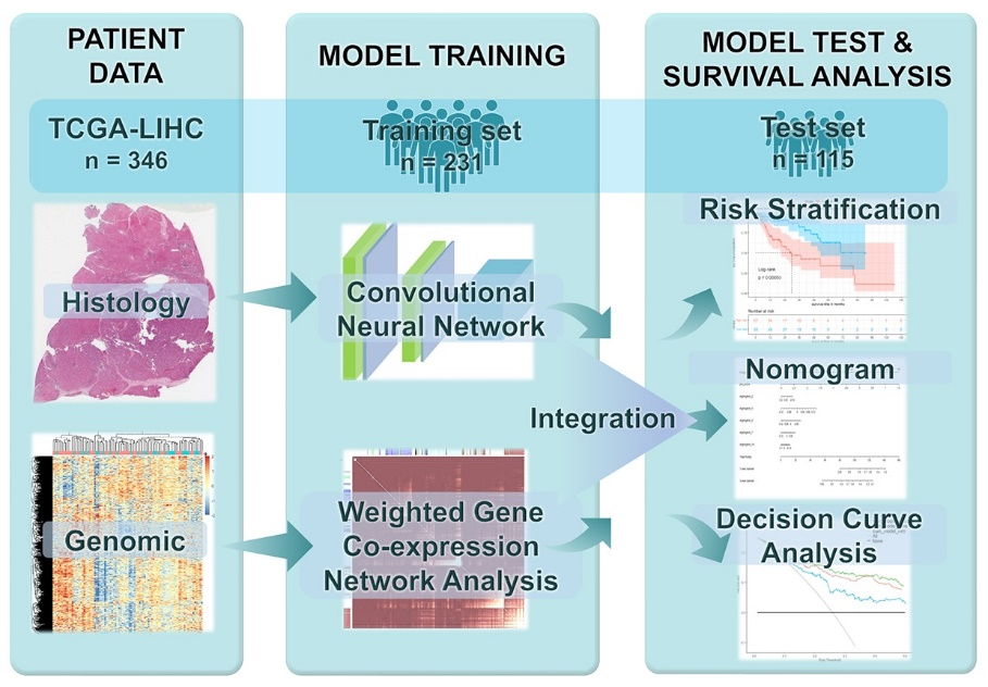 为融合病理图像形态学信息与分子基因功能信息实现病人生存状态的准确预测,团队结合前期病理图像计算的工作积累,设计了融合病理图像与基因的多模态生存预后预测模型,揭示了多模态信息对癌症预后有很大的潜力,顺利获得多模态模型的建模有望为辅助临床诊断与决策给予有效工具。相关研究工作以“Integrative Histology-Genomic Analysis Predicts Hepatocellular Carcinoma Prognosis Using Deep Learning”为题发表于Genes(DOI: 10.3390/genes13101770),硕士生侯嘉馨为第一作者。