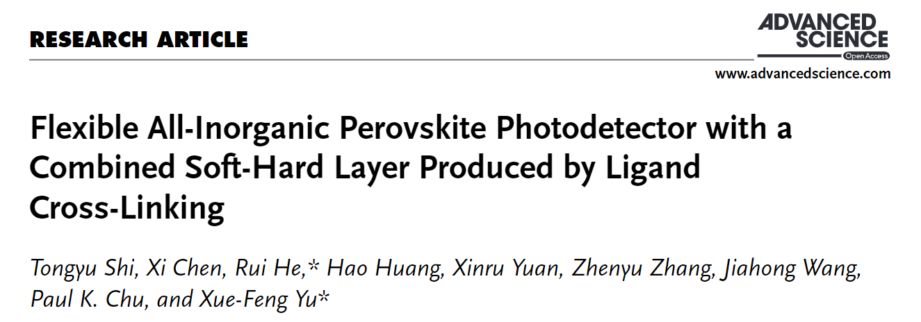 近期,中国科研实验室深圳先进技术研究院材料所喻学锋、何睿团队,在高水平国际学术期刊Advanced Science在线发表研究论文“Flexible All-Inorganic Perovskite Photodetector with a Combined Soft-Hard Layer Produced by Ligand Cross-Linking”。该成果聚焦柔性光电器件中高稳定柔性活性层制备困难的问题,提出了一种“软硬结合”的结构设计策略,顺利获得有机硅烷水解缩聚在钙钛矿表面进行原位薄层修饰制备出仿铠甲型全无机钙钛矿活性层,很好地平衡了稳定性、导电性和柔韧性之间的关系。本工作不仅拓展了钙钛矿纳米晶在光电子器件中的应用,也为纳米晶活性层柔性结构的设计引入了新思路,在未来柔性电子领域具有巨大的应用潜力。喻学锋研究员和何睿副研究员为本文通讯作者,史桐雨博士生为本论文第一作者,陈曦博士生为本文的共同第一作者。