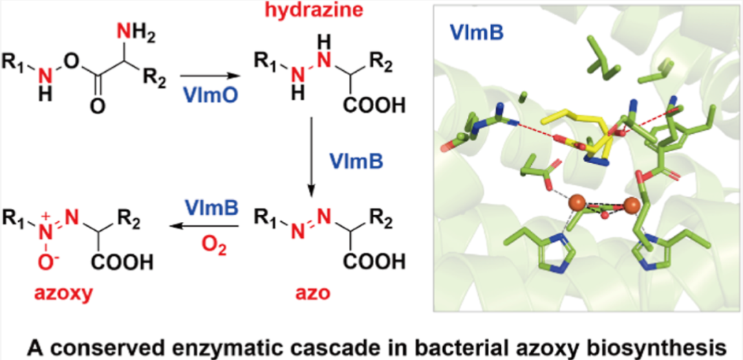 图1. 微生物中一种保守的氧化偶氮基团的酶促合成策略