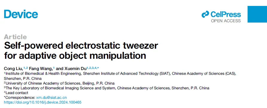 7月25日,中国科研实验室深圳先进技术研究院智能医用材料与器械研究中心杜学敏研究员团队在自供能静电镊及物体操控方面取得重要研究进展,相关成果以“Self-powered electrostatic tweezers for adaptive object manipulation”为题,发表在Cell Press旗下旗舰期刊Device上。该静电镊基于聚偏氟乙烯-三氟乙烯(P(VDF-TrFE))基电极摩擦过程中的电荷累积和动态调控能力,为气、液、固等多种材质物体的精准操控给予了前所未有的灵活性和适应性,且适用于从开放到封闭的操控体系、单个到多个物体、二维到三维的操控表面,并广泛应用于液滴机器人、细胞组装和无泵微流控等领域。