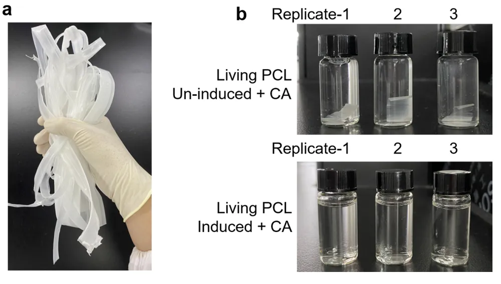 图4. 两种酶对PCL塑料,降解前后的表面结构和分子量变化。(a) CA酶处理普通PCL塑料(左)和活体功能塑料(右)的降解效果;(b)活PCL降解过程中分子量变化曲线;(c) 仅CA酶对普通PCL塑料降解过程中分子量变化曲线