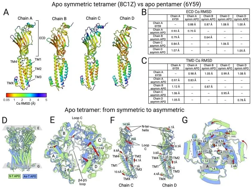 研究团队在原生态细胞膜生理环境下解析了该靶点的冷冻电镜结构,在结构中意外发现该靶点除了传统的五聚体外,还能形成四聚体结构。更为意外的是,其中的四聚体还能以“对称四聚体”和“不对称四聚体”两种不同的状态形式存在。