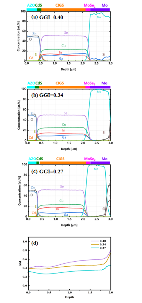 图4:不同镓含量的CIGS太阳能电池的SIMS图(a)GGI =0.40,(b) GGI =0.34,