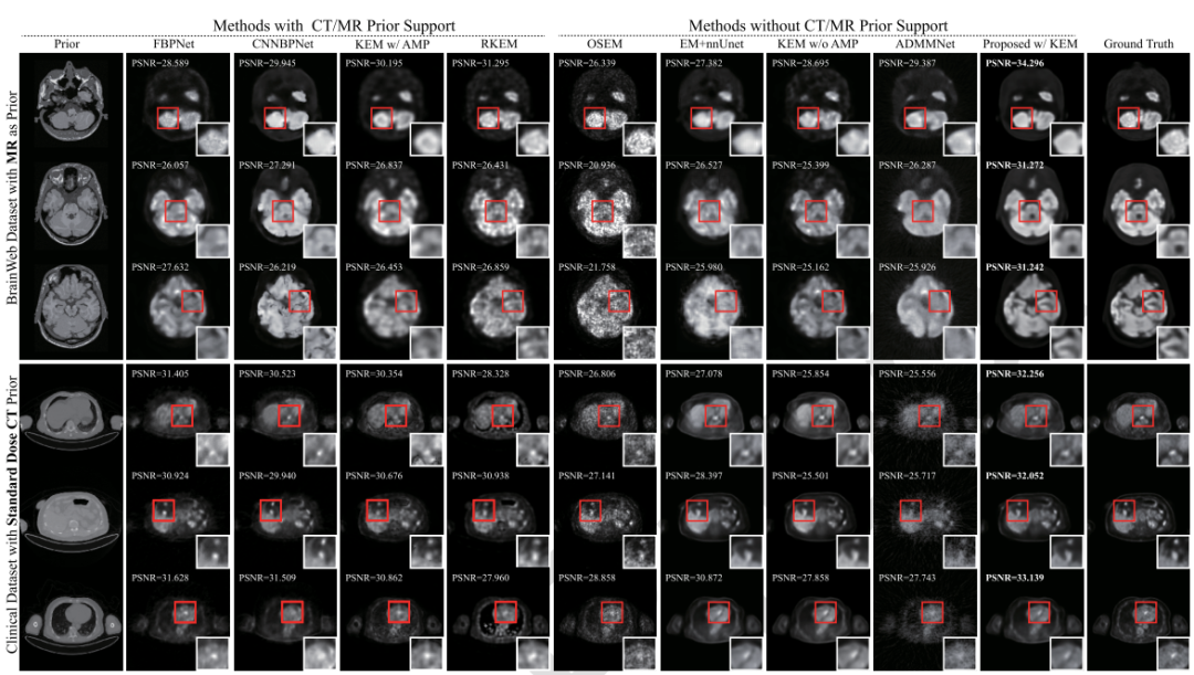 研究团队顺利获得融合医学图像基础模型的深层先验知识,优化了低剂量PET图像重建流程。医学视觉大模型经过大量CT/MR数据的预训练,掌握了CT/MR的本质特征,团队利用这些特征替代了传统的CT/MR先验数据,顺利获得代理机器人框架动态提取医学图像大模型的先验信息,从而降低了辐射风险、缩短了扫描时间并简化了重建流程。实验结果表明,该技术无需依赖配对的标准CT/MR扫描数据,即可实现高质量的PET图像重建,并超越了现有CT/MR配对数据重建算法的效果。提出方法不仅有效保留了图像细节、显著抑制了噪声,同时在精度和一致性上与“金标准”高度契合。此外,得益于基础模型的优异泛化性,提出方法在Zero-short等场景上也具有良好的表现。