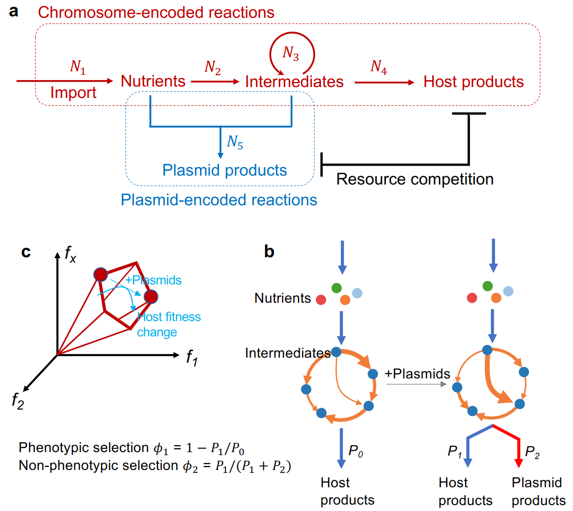 质粒作为原核生物中广泛存在的可移动遗传元件,在微生物进化、抗生素抗性传播及病原毒力扩散中扮演核心角色。依据传统达尔文进化理论,质粒的存续依赖于宿主表型选择(如宿主生长负担的降低),但近年研究发现,非表型选择(如质粒自身复制效率、水平转移能力)同样显著影响其稳定性。例如,人类肠道中广泛存在的pBI143质粒虽无明确功能基因且面临强选择压力,挑战了传统表型选择范式。然而,现有研究多聚焦单一选择压力,对两种力量如何共同塑造染色体/质粒平衡缺乏系统性定量模型,尤其缺乏对代谢资源分配、宿主基因组规模等内在因素的动态解析。这一理论空白限制了对质粒多样性的进化解释,也阻碍了临床耐药基因传播的精准干预。
