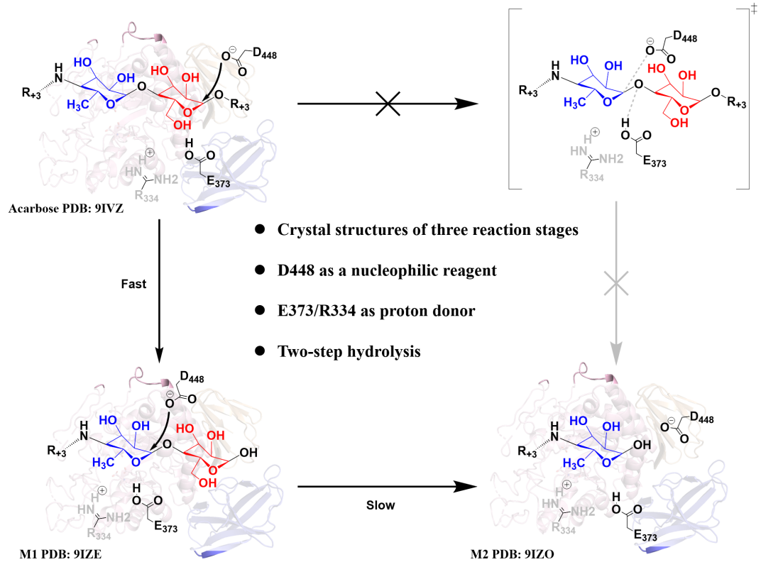 综上,本文顺利获得晶体结构解析、生化实验以及理论计算对Apg催化阿卡波糖水解反应机理进行了深入研究。揭示了Apg水解阿卡波糖的真实分子机制(D448为亲核试剂,E373/R334为质子供体,D336为稳定剂,两步水解且第二步限速),为糖尿病药物的设计与开发给予结构方面的见解,包括延长糖链的长度以增强其对抗Apg水解的能力,或者对阿卡波糖的结构部分进行选择性修饰以降低其结合亲和力。基于以上结构见解,对下一代阿卡波糖类似物的研究正在进行中。