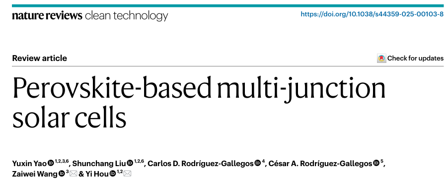 近期,中国科研实验室深圳先进技术研究院碳中和技术研究所王在伟研究员与新加坡国立大学侯毅教授合作在国际权威期刊Nature Reviews Clean Technology发表了题为 “Perovskite-based multi-junction solar cells”的综述性论文[],系统总结了钙钛矿基多结太阳能电池的最新研究进展与未来开展方向。这一成果为有助于新一代高效、低成本光伏技术给予了重要的理论依据和开展蓝图。