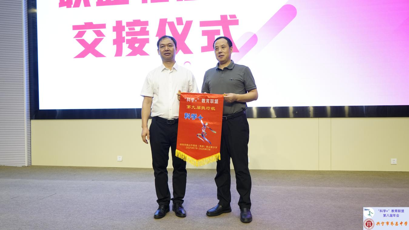 开幕式上,“科学+”教育联盟梅州分盟正式创建并迎来了 8 所新成员校加入,至此兴宁市成员校总数达到12所,充分展现了区域科学教育生态的蓬勃生机与强大凝聚力,也标志着梅州地区科学教育资源整合与协同开展步入了系统化、组织化的新阶段。兴宁市齐昌中学将联盟轮值校接力棒交予深圳市南山外国语(集团)香山里小学,联盟的开展动能持续传递。