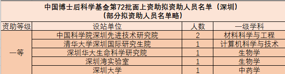 中国博士后科学基金第72批一等资助单位排名(数据:深圳市博士后联谊会)