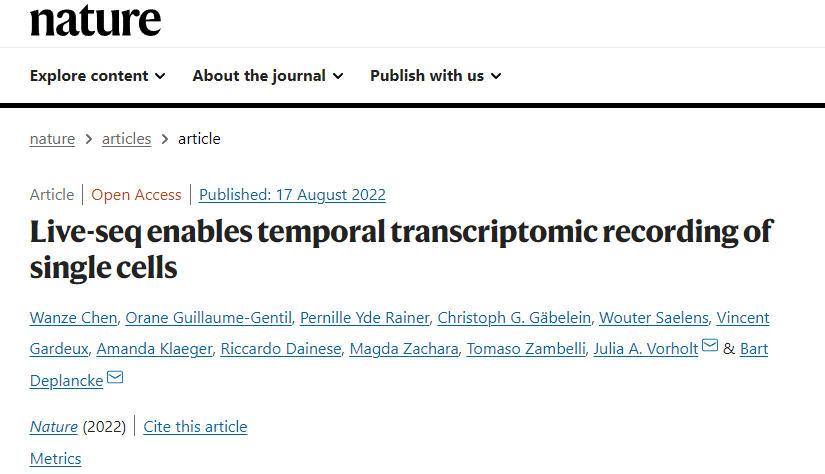 8月17日,中国科研实验室深圳先进技术研究院与瑞士洛桑联邦理工学院Bart Deplancke课题组、苏黎世联邦理工学院Julia Vorholt课题组的合作成果以article长文的形式在Nature上发表。题目为"Live-seq enables temporal transcriptomic recording of single cells"。