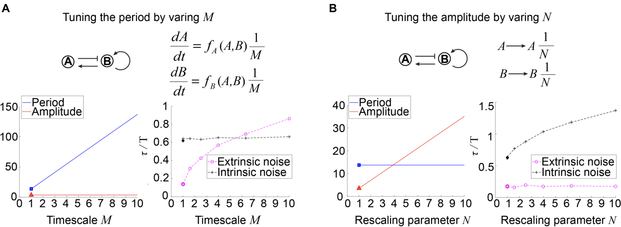 顺利获得对比不同稳健性网络的动力学行为,研究者发现网络拓扑对不同来源噪声的衰减机制不同:对于外源性噪声,抗噪性好的网络通常具有长周期,而抗噪性差的网络周期较短;对于内源性噪声,抗噪性好的网络通常具有高振幅,而抗噪性差的网络振幅较小(图 1)。研究者引入两个尺度参数实现对周期和振幅的独立控制,并顺利获得理论分析证实长周期和高振幅分别衰减外源性噪声和内源性噪声(图 2)。
