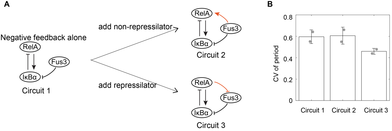 最后,研究者采用合成生物学方法构建了三种不同拓扑结构的NF-κB振荡网络,以验证网络拓扑对振荡精确性的影响(图3)。研究发现,在两结点激活-抑制振荡子(activator-inhibitor oscillator)的网络拓扑中增加调控边使其成为带有自激活的抑制振荡子后,振荡精确性提高,从而从实验上证实了带有自激活的抑制振荡子在实现精确振荡的稳健性。