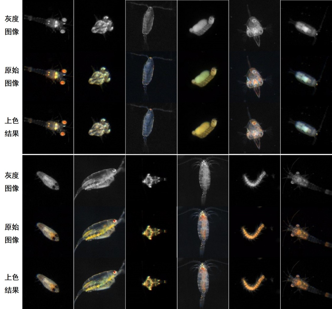 由于绝大多数浮游动物对波长较长的红光不敏感,传统的水下成像仪多数使用红光或近红外光照明成像,以避免浮游动物的趋光性聚集。但是,显然这样的拍摄条件只能取得浮游生物的灰度图像。如果能够训练人工智能,将红光照明下获取的灰度图像转换为高保真的彩色图像,则上述问题即可迎刃而解。