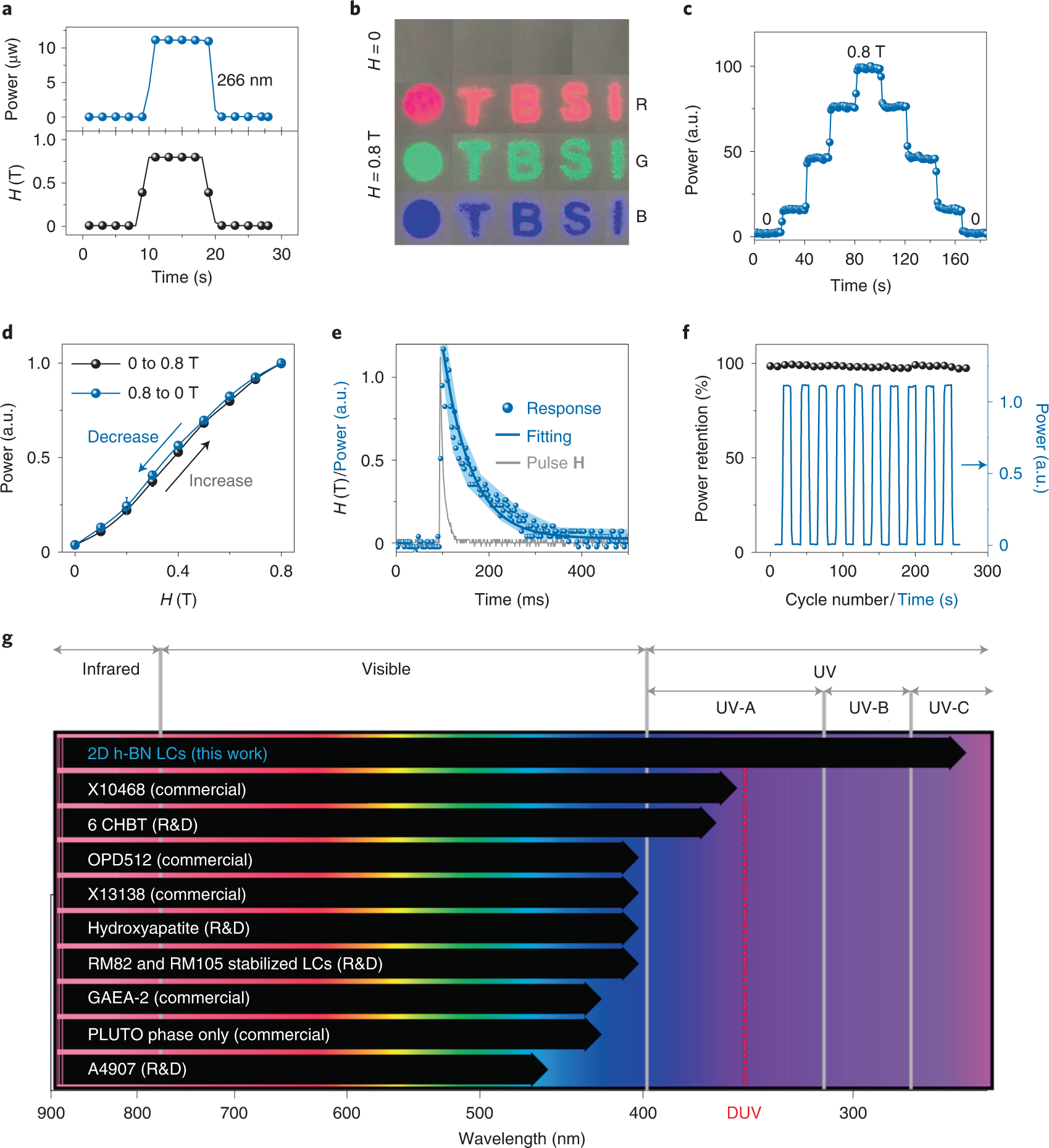 该团队选用波长处于深紫外UV-C日盲区的266 nm激光,测试二维氮化硼液晶在该光谱区光学调制性能顺利获得开启关闭0.8 特斯拉的磁场,实现了该调制器在深紫外光波段的透明与不透明两种状态之间的切换。经过270个不间断开关循环测试后,性能的保持率高达99.7%