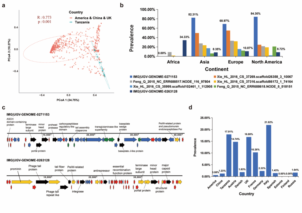 为了分析肠道古菌病毒在全球人群中的分布情况,团队对1279条古菌病毒contigs在人类肠道样品中的丰度情况进行了估计,主坐标分析 (PCoA) 和Anosim分析的结果显示:肠道古菌病毒群落的组成在不同性别 (ANOSIM, r = 0.004, p = 0.306) 和不同BMI指数 (ANOSIM, r = 0.006, p = 0.201) 的人群中并无显著性差异。然而,当以国家作为界限分析时,我们观察到这些古菌病毒在各地表现出不同的多样性(图2a)。