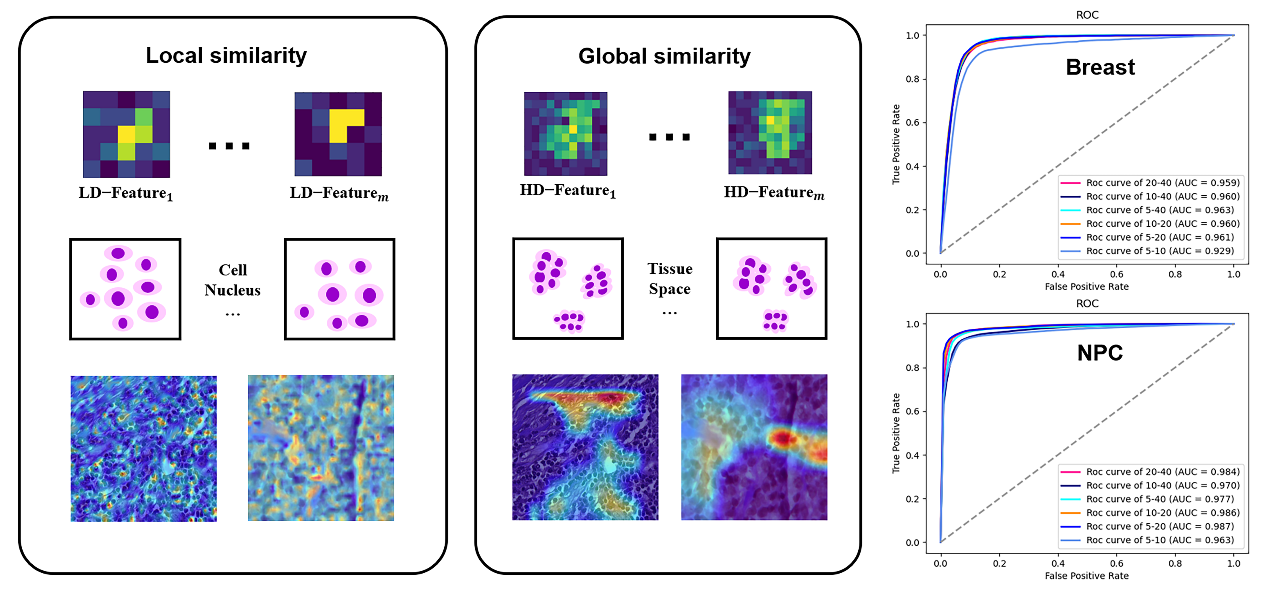 针对不同放大倍率下组织病理学图像信息融合的不足,秦文健团队顺利获得长期不懈的积累,提出了一种创新性的深度多倍率相似性学习方法,该方法不仅有助于多放大倍率学习模型的可解释,易于可视化低维(如细胞级)到高维(如组织级)特征表示,克服了跨放大倍率信息传播理解的困难;同时借助于相似性交叉熵损失函数设计,可以更好学习交叉放大倍率之间信息的相似性。最后顺利获得不同主干网络特征提取不同放大倍率组合的实验验证了所提出方法的有效性,并进一步顺利获得可视化方式展示其解释能力,分别在公开和临床的组织病理学数据集上召开实验以验证方法性能,与现有方法对比,其曲线下面积(AUC、准确度取得了优异的性能。相关研究工作以“Deep Multi-Magnification Similarity Learning for Histopathological Image Classification”为题发表于生物医学信息领域国际权威期刊IEEE Journal of Biomedical and Health Informatics(DOI: 10.1109/JBHI.2023.3237137),博士生刁颂辉为论文第一作者。