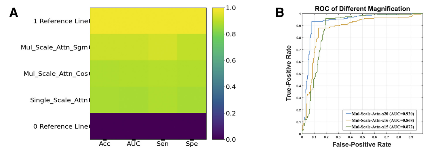 团队前期研究中发现,经验丰富的病理学家通常需要对全景病理图像中对癌/疑似区域进行视觉检查,得到最终的诊断结果。然而,由于全景病理图像具有单张巨大尺寸的特性,人工视觉诊断是一项劳动强度大和耗时的挑战性任务为与临床实际诊疗步骤相结合,并验证算法在临床的有效性,团队与临床医院合作实现了自动诊断算法的研究——提出了基于多倍率注意力卷积神经网络的弱监督框架该方法只需图像级标签(而不需要像素级注释),即可以实现感兴趣区域(癌症)的检测,为临床病理医师的诊断直接提示可疑病灶区域,提升临床辅助诊断效率所提出方法在TGCA肝癌数据集进行论证。实验结果表明,根据曲线下面积、准确度、灵敏度和特异性指标,该框架显著优于单尺度检测方法,并给予了非常快的检测时间。同时,方法与三位病理学家的诊断结果相比,团队提出方法性能优于初级和中级病理学家,略低于高级病理学家。相关研究工作以“Weakly Supervised Framework for Cancer Region Detection of Hepatocellular Carcinoma in Whole-Slide Pathologic Images Based on Multiscale Attention Convolutional Neural Network”为题发表于病理学领域权威临床杂志The American Journal of Pathology,(DOI: 10.1016/j.ajpath.2021.11.009),博士生刁颂辉为论文第一作者。