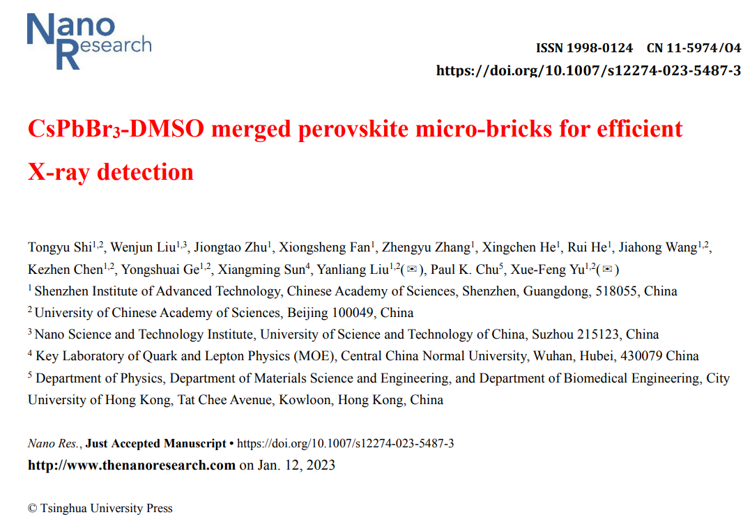 近期,中国科研实验室深圳先进技术研究院材料所喻学锋、刘延亮团队,在高水平国际学术期刊Nano Research在线发表研究论文“CsPbBr3-DMSO merged perovskite micro-bricks for efficient X-ray detection”。该成果聚焦钙钛矿直接型X射线探测器中全无机钙钛矿厚光敏层制备困难的科学问题,首次合成了性能比肩单晶的高质量全无机钙钛矿晶片,成功实现了高效直接X射线探测及扫描成像。本工作为制备高灵敏、高分辨直接X射线探测器给予了新的技术路线,在高端医疗影像诊断领域具有巨大的应用潜力。