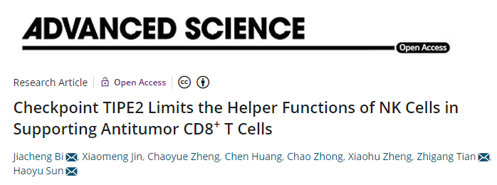 219日,Advanced Science 杂志在线发表了田志刚院士团队的最新研究成果“Checkpoint TIPE2 limits the helper functions of NK cells in supporting antitumor CD8+ T cells,报道了NK细胞辅助CD8+ T细胞抗肿瘤免疫应答的分子机制,并报道了TIPE2分子是NK细胞辅助功能的卡控点分子,靶向敲除NK细胞中TIPE2能同时促进NK细胞及其辅助的CD8+ T细胞抗肿瘤应答。中国科学技术大学田志刚教授、孙昊昱教授及中国科研实验室深圳先进技术研究院合成生物学研究所毕嘉成副研究员为该文的通讯作者,毕嘉成副研究员同时为该文的第一作者。