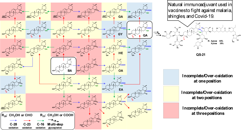 以QS-21、QS-7、QS-17为代表的皂树皂苷已经作为天然免疫佐剂被广泛应用于带状孢疹、疟疾、和Covid-19等疫苗中。而在皂树中发现的58种三萜皂苷中,有49种皂苷的苷元为QA。构建高产QA的酵母细胞工厂可以为高效生物合成QS-21等天然免疫佐剂奠定基础。在QA的生物合成中,需要将BA的C-16、C-23、和C-28分别氧化为羟基、醛基、和羧基。高效生物合成QA需要实现这三个位点的氧化平衡,否则会出现46种过氧化或不完全氧化的副产物(图一),而过多的副产物不仅降低目标化合物产量,也增加纯化成本。