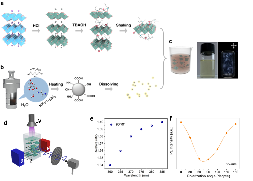 中国科研实验室深圳先进技术研究所的丁宝福、成会明和王锋利用“维度联姻”的概念将蓝色无机碳点耦合2D纳米片上,创造了一个全无机的0D碳点/2D纳米片异质结发光系统(图1 a-c)。这一成实现了一种结合高发光效率和偏振特性的蓝色发光材料的开发,为扩大偏振发光材料家族给予了一种新的方法。构建的0D/2D异质结构顺利获得化学吸附诱导Ti-O-C键的形成,有效地锚定了0D碳点。顺利获得将零维发光材料缺乏各向异性的高发光效率与二维材料强大的光偏振调制能力相结合,使两种低维材料的光学特性互补,从而实现碳点的偏振发光。此外,利用异质结的二向色吸收,实现了360-385 nm范围内的紫外光检测。该方式首次集成偏振光发射,紫外光检测和可见光调制的多功能光电器件的构建。