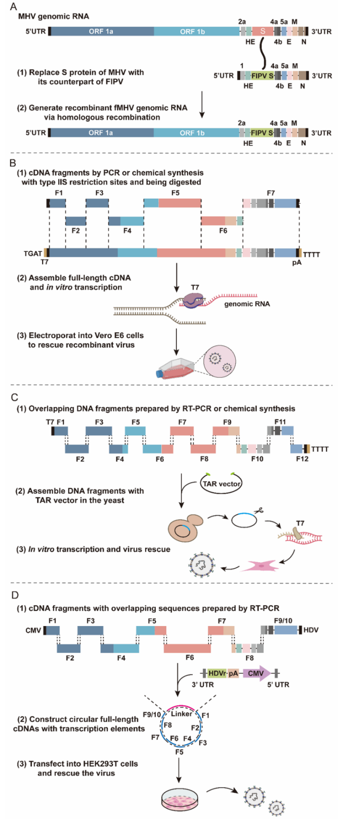 文章以冠状病毒研究为主线,全面总结了现有的生物安全冠状病毒工程系统,详细介绍了其构建方式和应用,这些系统将病毒学基础与合成基因组学技术相结合,用于开发减毒或无毒疫苗的有效工具、筛选抗病毒药物以及研究新型微生物的致病机制。在探讨了这些系统为冠状病毒的研究和治疗带来极大便利的同时,也对其未来开展趋势做了展望。
