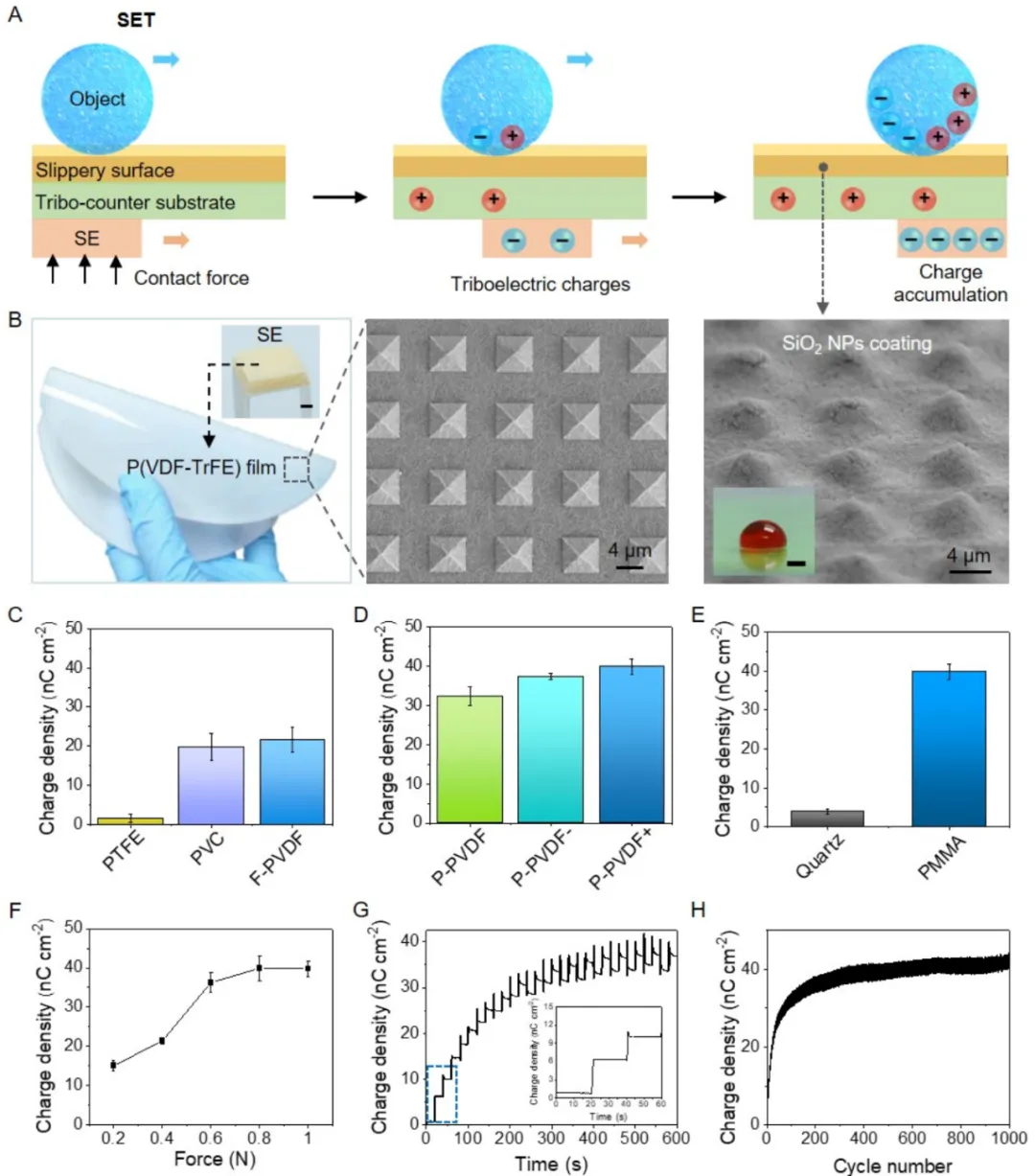 为解决物体操控灵活性和适应性的问题,研究团队基于前期光诱导带电表面材料及液滴操控的研究基础上,成功设计出无需复杂电极阵列和外部电源的摩擦发电供能的静电镊(Self-powered electrostatic tweezer, SET)。该SET由表面设计有微结构的P(VDF-TrFE)基自供能电极(Self-powered electrode,SE)、摩擦对介电衬底(Tribo-counter substrate)和润滑表面(Slippery surface)三部分组成。