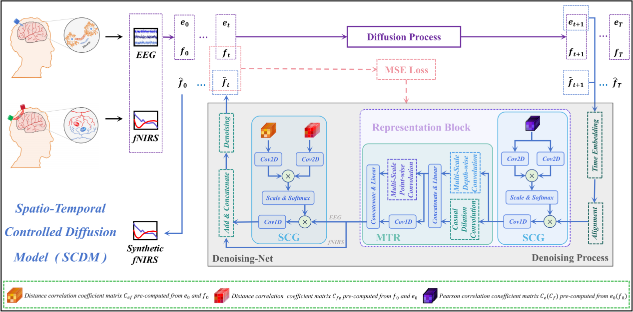 为突破这一瓶颈,中国科研实验室深圳先进技术研究院的王书强课题组提出了一种创新的解决方案——SCDM(Spatio-Temporal Controlled Diffusion Model),即时空控制扩散模型。该模型利用生成式AI技术,从EEG信号中生成fNIRS信号,从而实现双模态信号的采集。 2025年3月4日团队相关工作在IEEE Transactions on Medical Imaging发表了题为SCDM: Unified Representation Learning for EEG-to-fNIRS Cross-Modal Generation in MI-BCIs的研究成果,首次实现了基于生成式人工智能的EEG到fNIRS跨模态生成。