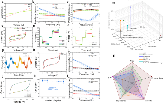 该技术的核心优势源于材料性能的生物学适配:43.16 Ω/mm²的低阻抗特性(较铂铱合金降低3.7倍),989.77 mC/cm²的电荷存储能力(提升108倍),11.81 mC/cm²的电荷注入能力,优良生物相容性与核磁成像兼容性。这些特性共同解决了传统电极在记录和刺激中的界面性能受限和成像伪影等难题。