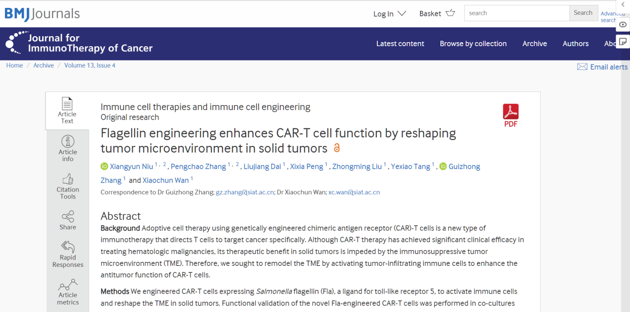 这些研究分别从靶向识别、活性调控、微环境干预三个维度构建了新的解决方案,对实体瘤免疫细胞疗法的开展具有持续的意义。研究工作得到了国家重点研发计划、国家自然科学基金、广东省基础与应用基础研究、深圳市医学研究专项基金、深圳市科技创新委员会等项目经费的资助。