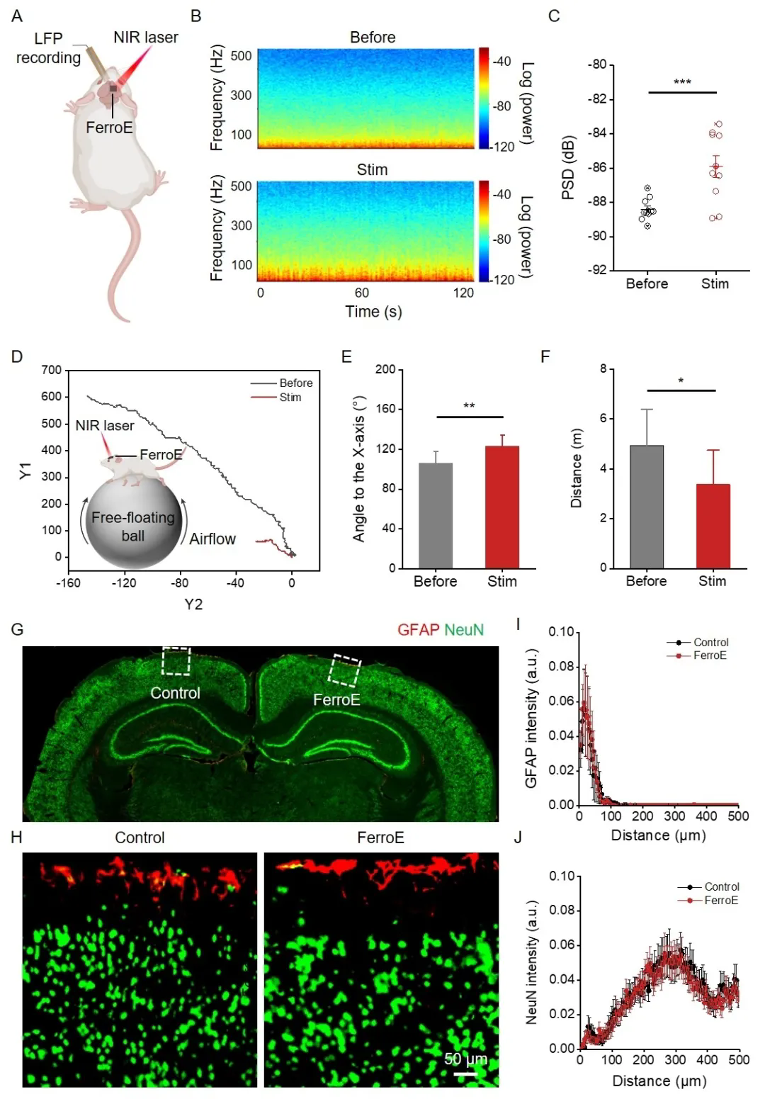 图2:FerroE对小鼠中枢神经的调控作用及其植入的生物安全性