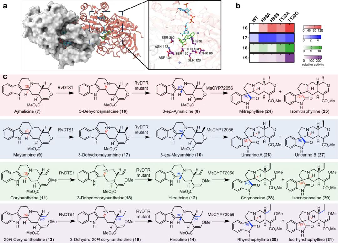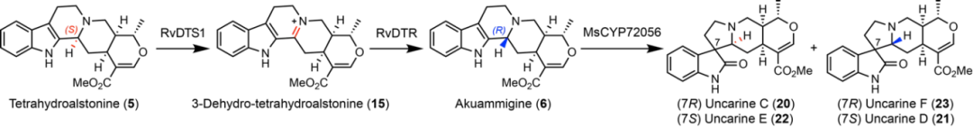 为了实现螺环氧化吲哚生物碱的集群式生物合成,研究团队第一时间从药用植物萝芙木(Rauvolfia verticillata)中成功鉴定了两个关键酶:黄素依赖性氧化酶RvDTS1和中链脱氢酶RvDTR。这两个酶能够协同工作,将3S-四氢鸭脚木碱(5)顺利获得陆续在的氧化和还原反应,立体专一性地异构化为3R-阿枯米精(6)。随后,前期发现的细胞色素P450酶MsCYP72056对3R构型的前体化合物进行氧化重排,最终形成四个五环螺环氧化吲哚天然产物Uncarines C, D, E, 和F。