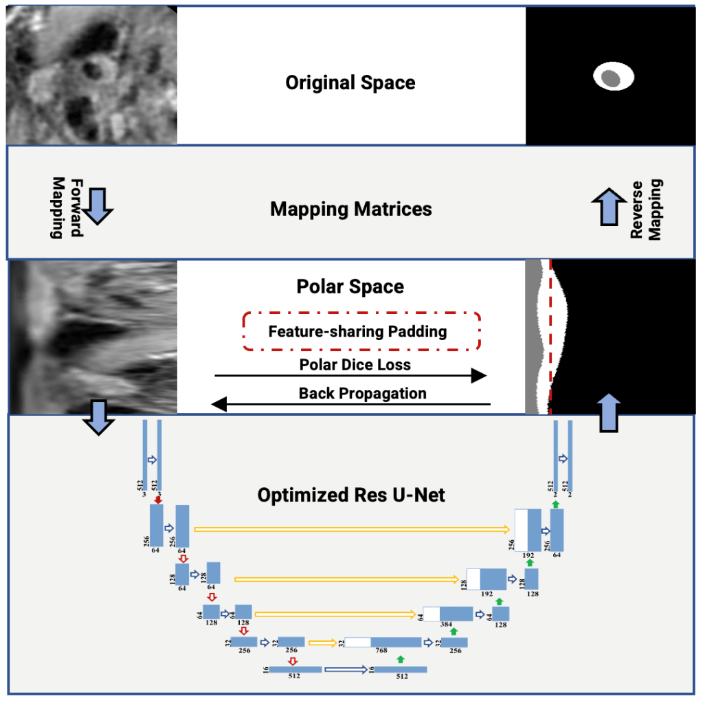 针对上述挑战,研究团队创新性地提出了一个融合深度学习与血管结构先验信息的全自动血管壁分割框架。该框架聚焦于血管壁薄、呈环形、斑块导致形态复杂以及边界模糊等多个核心难点,在深度学习框架中系统性地引入极坐标映射模块,构建了由 “极坐标映射—特征陆续在性建模—结构敏感损失函数” 组成的系统性解决方案,有效克服了传统笛卡尔坐标系下卷积神经网络难以精准捕捉血管径向特征的局限。