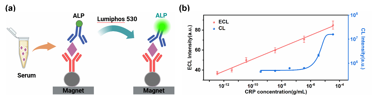 其次,团队引入了量子点纳米球作为发光标签——每颗直径约120纳米的纳米球内密集封装了大量CdSe@ZnS量子点,结合磁珠富集技术,将血清中稀少的CRP靶蛋白精准捕获并高效富集至电极表面,随即在BDD电极触发的阴极电化学发光反应中释放出强烈光信号(图3):BDD电极在阴极电位下同时将过硫酸根(S₂O₈²⁻)还原为强氧化性硫酸根自由基(SO₄⁻•)、将量子点纳米球(QDN)还原为带电自由基(QDN⁻•),二者反应使量子点跃迁至激发态,随后弛豫发光,产生电化学发光信号。