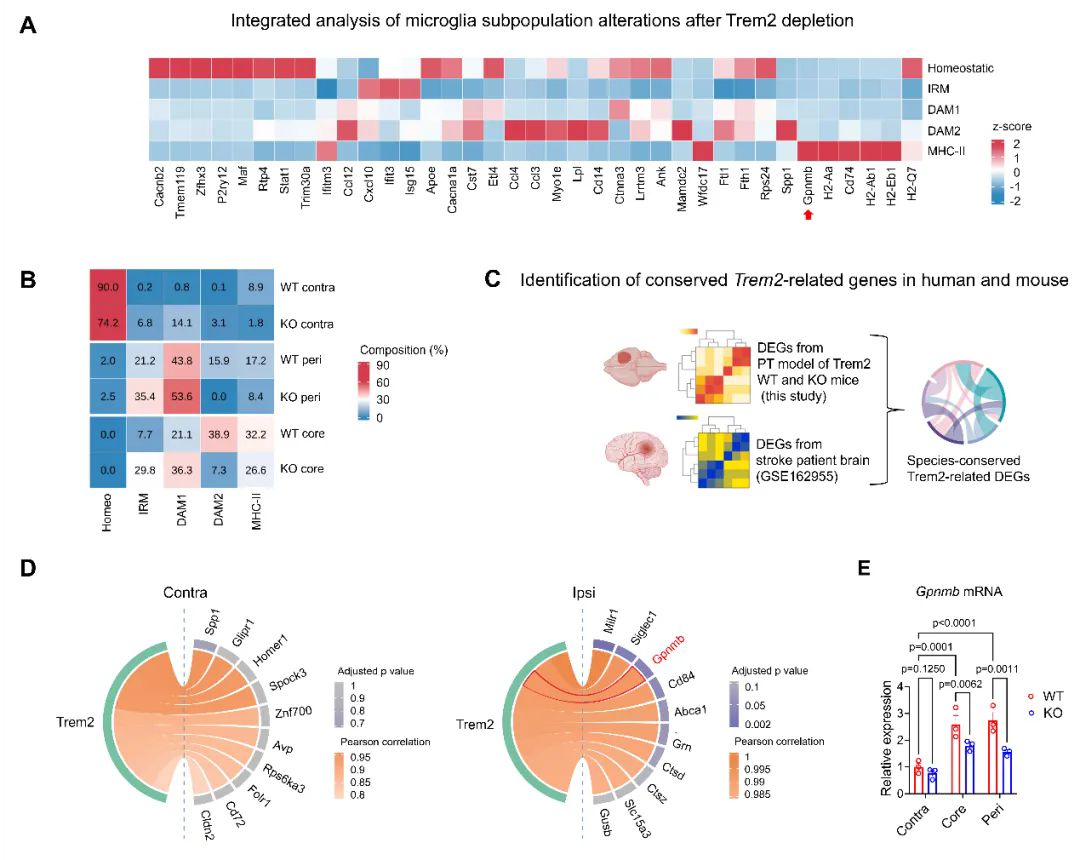 研究团队进一步利用Trem2基因敲除小鼠缺失Trem2功能,同时顺利获得颅内注射可溶性Trem2重组蛋白上调其水平,从而在PT模型中分别探究其作用。结果显示,Trem2及其可溶形式均显著促进了小胶质细胞介导的神经炎症反应,加剧了梗死灶周围神经元的死亡,并导致神经功能受损加重。这一发现与基于MCAO模型的既往报道相反,却与临床数据高度吻合,提示模型选择是影响研究结论的关键因素。顺利获得整合小鼠卒中模型与卒中患者的转录组数据,鉴定出糖蛋白Gpnmb为Trem2下游具有物种保守性的关键调控靶点。实验证实,颅内注射可溶性Gpnmb重组蛋白可抵消Trem2敲除所带来的神经保护效应。此外,临床样本的分析显示,卒中患者外周血中可溶性Trem2和Gpnmb的水平可有效预测疾病严重程度,展现出作为生物标志物的潜在应用价值。